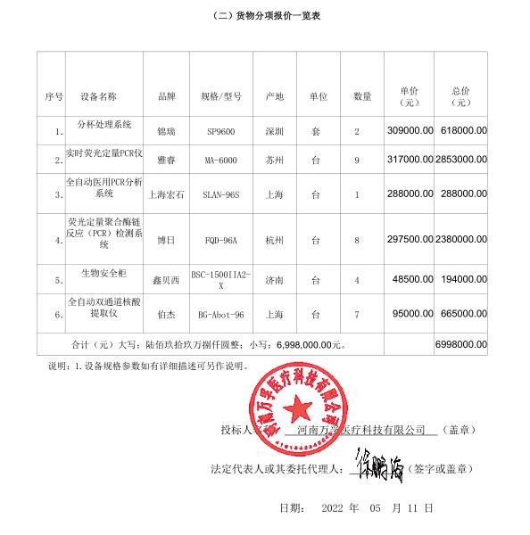 4.采購內容:生物安全柜4臺、全自動雙通道核酸提取儀7臺、實時熒光定量PCR儀9臺、全自動醫(yī)用PCR分析系統(tǒng)1臺、分杯處理系統(tǒng)2套、熒光定量聚合酶鏈反應(PCR)檢測系統(tǒng)8臺