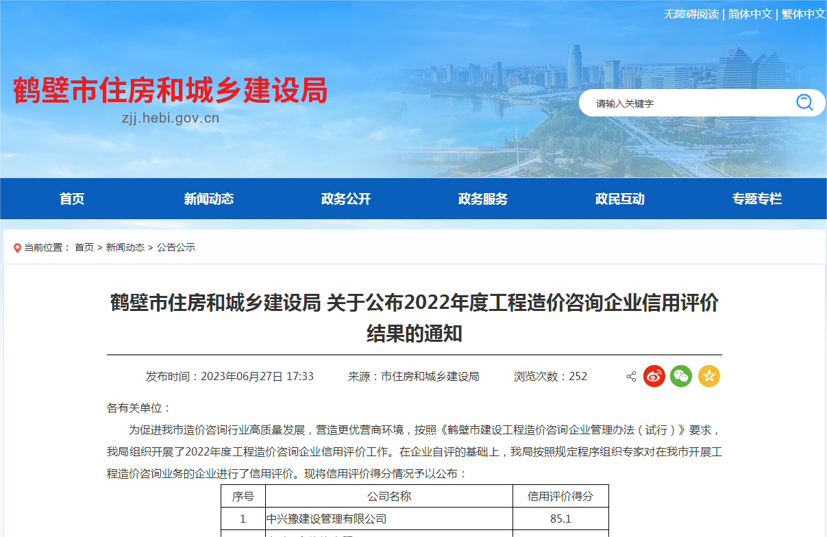 近日,鶴壁市住房和城鄉(xiāng)建設(shè)局公布了“2022年度工程造價(jià)咨詢(xún)企業(yè)信用評(píng)價(jià)結(jié)果的通告”。經(jīng)企業(yè)自評(píng)、專(zhuān)家評(píng)審等程序,中興豫建設(shè)管理有限公司信用評(píng)價(jià)得分位居第一。